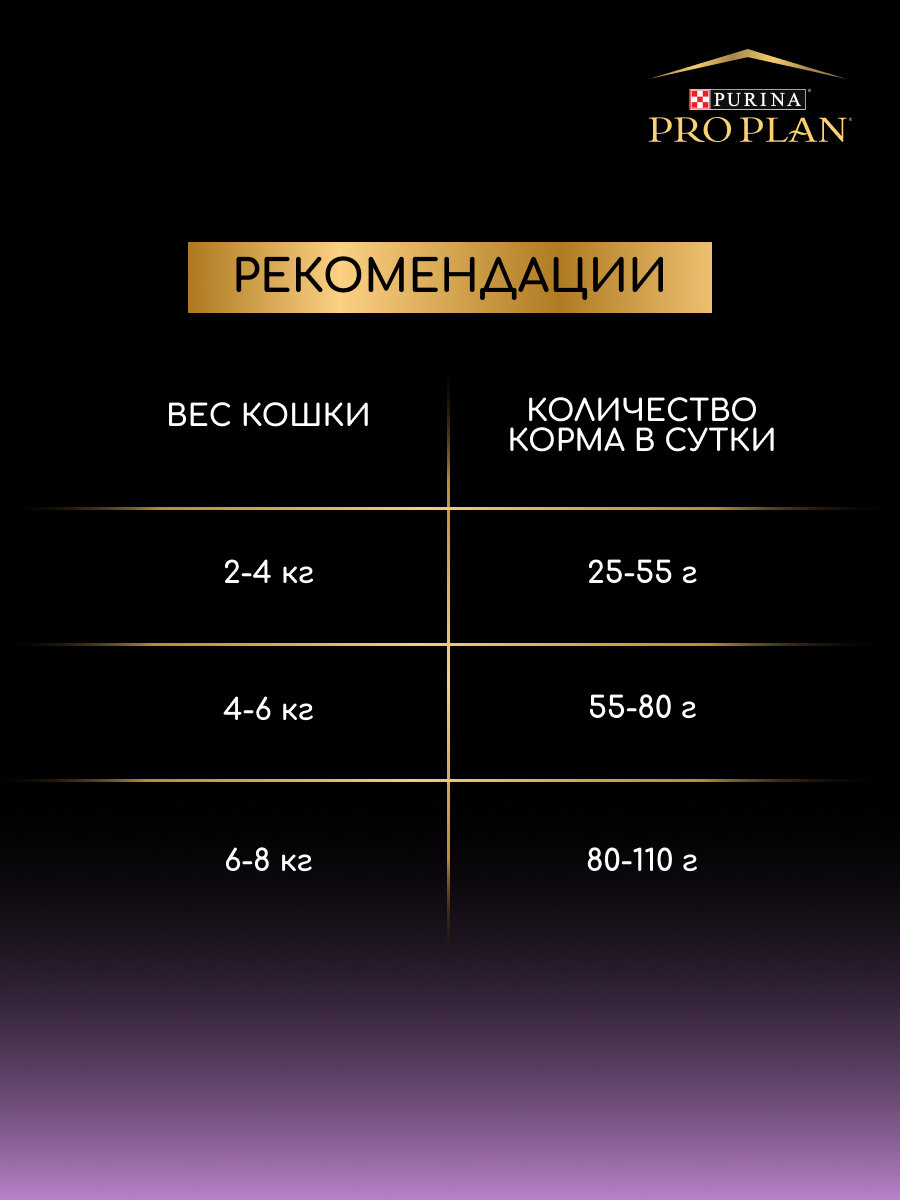 | Дополнительная информация | рекомендации по кормлению, позволяющие поддерживать идеальную форму могут варьироваться в зависимости от возраста животного, его активности и условий окружающей среды; следите за весом вашей кошки и корректируйте количество даваемого корма; следите, чтобы у вашей кошки всегда была чистая, свежая питьевая вода; для здоровья вашей кошки регулярно консультируйтесь с ветеринарным врачом |