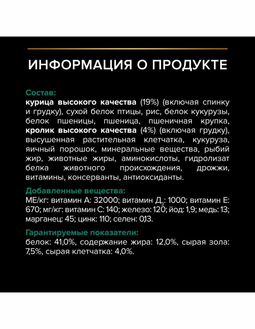 | Состав | курица, сухой белок птицы, рис, кукурузный глютен, пшеничный глютен, пшеница, пшеничные волокна, кролик (4%), кукуруза, яичный порошок, минеральные вещества, рыбий жир, животный жир, консерванты, вкусоароматическая кормовая добавка, дрожжи, витамины, аминокислоты |