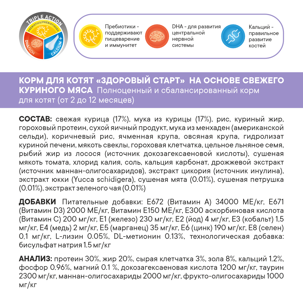| Состав | свежая курица (17%), мука из мяса курицы (17%), рис, куриный жир, сохраненный смесью натуральных токоферолов (витамин Е), гороховый протеин, сушеное яйцо, мука из американской сельди (менхаден), коричневый рис, специально обработанные ядра ячменя и овса, гидролизат куриной печени, мякоть свеклы, клетчатка гороха, цельное семя льна, жир лосося (источник DHA), сушеная мякоть томата, калия хлорид, лецитин, холина хлорид, соль, кальция пропионат, кальция карбонат, экстракт дрожжей (источник маннан-олигосахаридов), таурин, натрия бисульфат, DL-метионин, экстракт цикория (источник инулина), железа сульфат, аскорбиновая кислота (витамин С), L-лизин, цинка оксид, натрия селенит, альфа-токоферол ацетат (витамин Е), никотиновая кислота, экстракт юкки Шидигера, кальция иодат, марганца оксид, D-кальция пантотенат, тиамина мононитрат, рибофлавин, пиридоксина гидрохлорид, витамин А, холекальциферол (витамин Д3), цинка протеинат, биотин, сушеная мята (0,01%), сушеная петрушка (0,01%), экстракт зеленого чая (0,01%), марганца протеинат, витамин В12, кобальта карбонат, фолиевая кислота, меди протеинат |