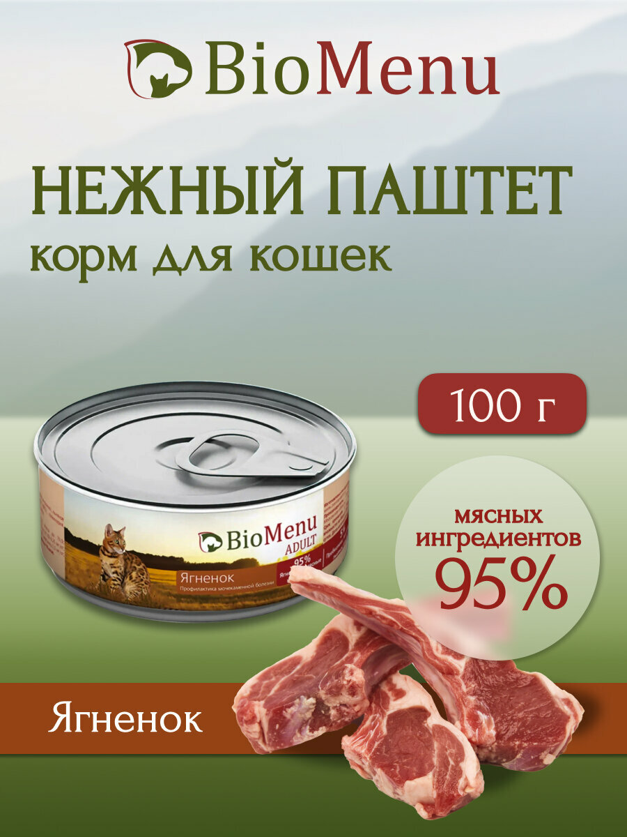 BioMenu ADULT Консервы для кошек мясной паштет с Ягненком 95%-мясо 100г х 24 шт