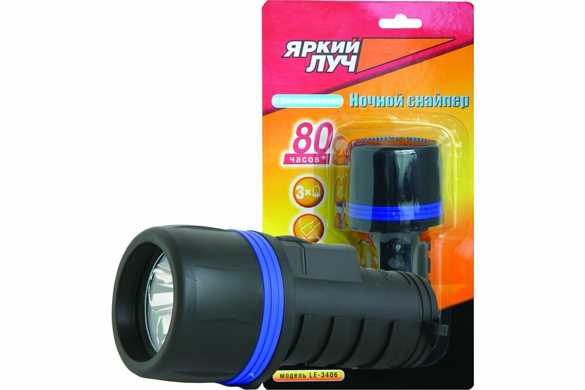 Фонарь Яркий ЛУЧ LE-3406 "Ночной снайпер 4AA" резиновый, 3 светодиода, на 4хAA 4606400102038 .