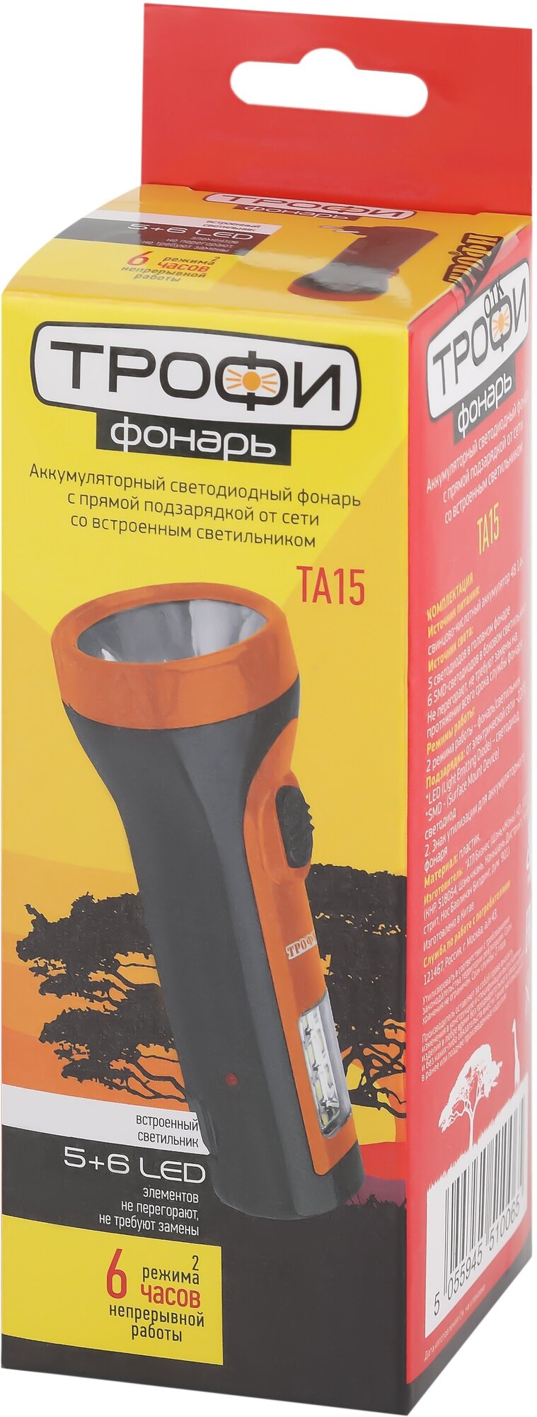 TA15 Фонарь Трофи Акку 4V1Ah, 2в1, 5xLED+6SMD, карт (18/90/1080)