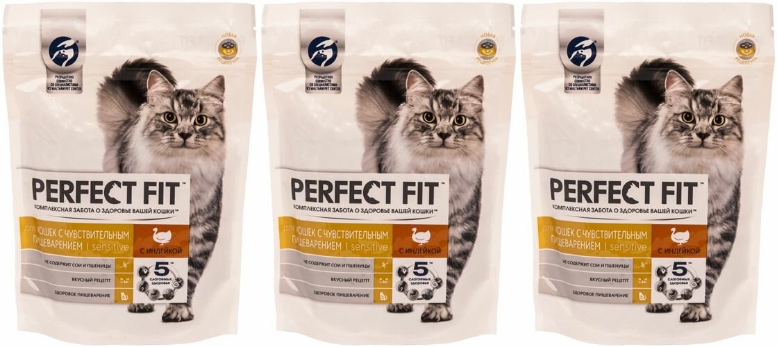 Сухой полнорационный корм PERFECT FIT для взрослых кошек с чувствительным пищеварением, с индейкой, 3 шт по 650 г