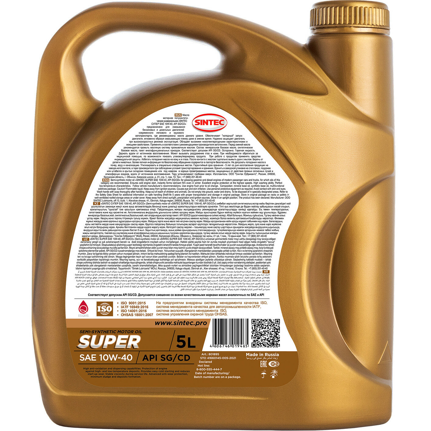 Моторное масло SINTEC SUPER SAE 10W-40, API SG/CD, Полусинтетическое, 5 л., арт. 801895