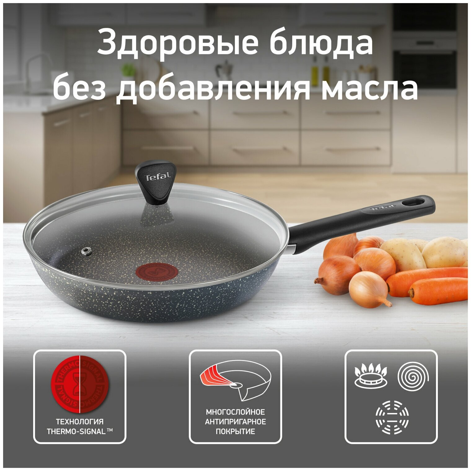 Сковорода с крышкой Tefal Natural Cook 04211926, диаметр 26 см, с индикатором температуры и антипригарным покрытием, для газовых, электрических плит