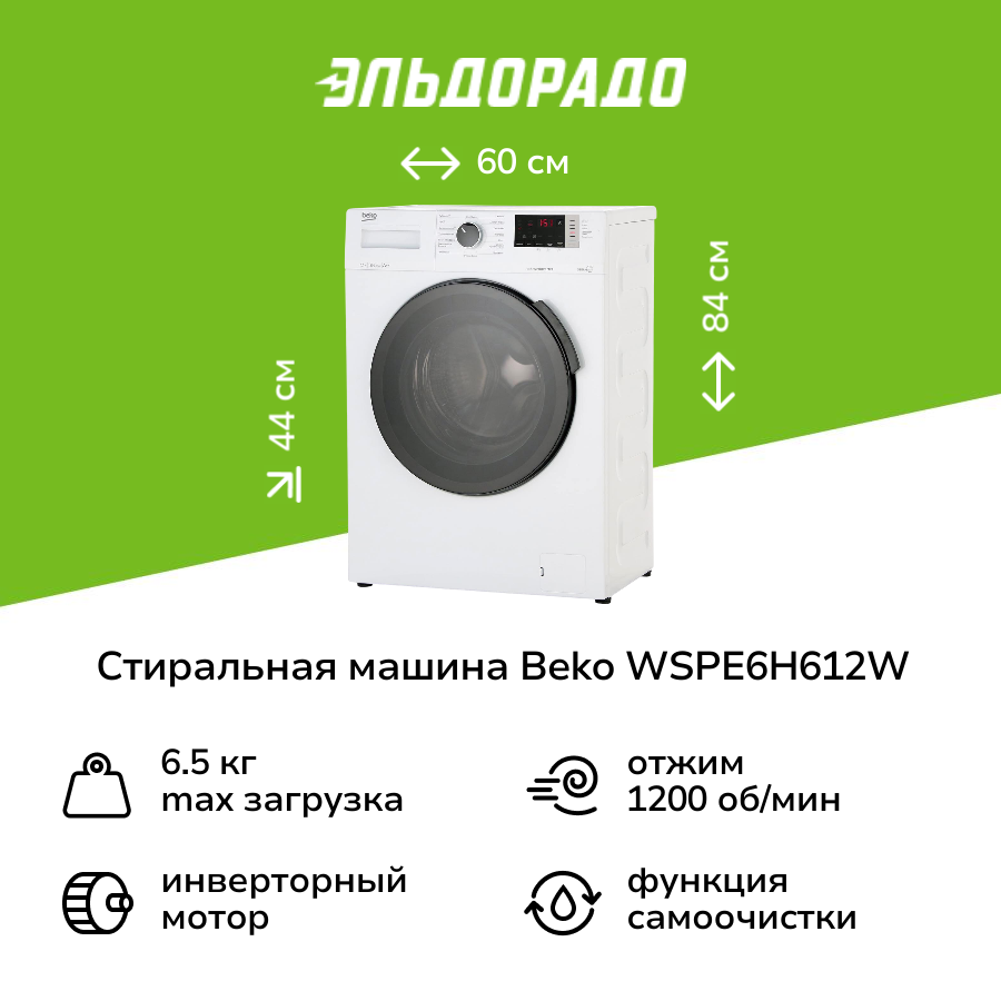 Узкая стиральная машина Beko WSPE6H612W, 6.5 кг, белый
