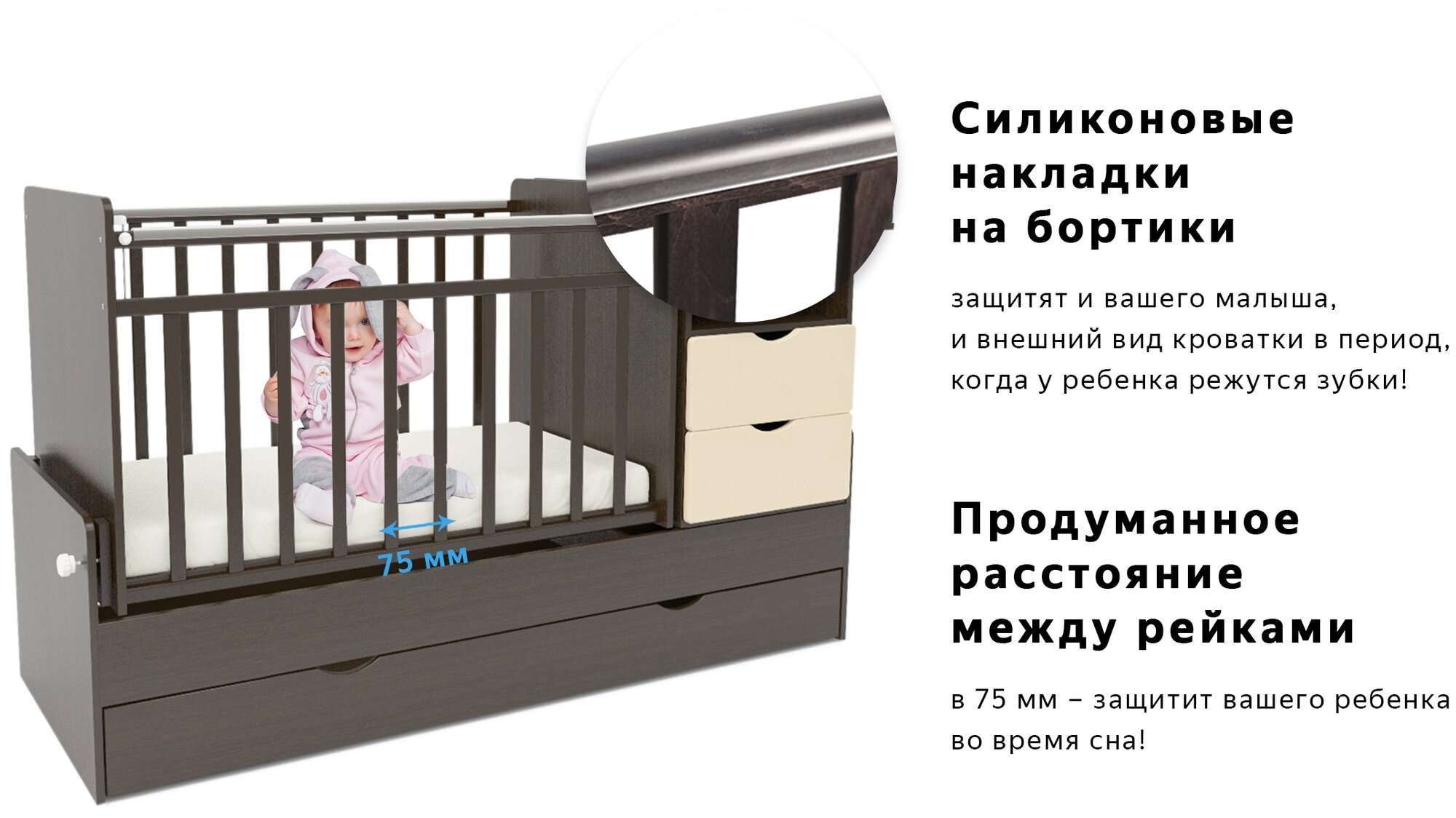 | Плюсы: | универсальная кроватка + пеленальный комод с удобными ящичками |