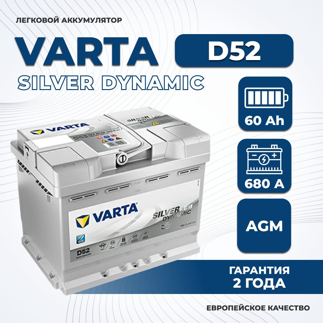 Аккумулятор (АКБ) VARTA AGM Silver Dynamic D52 60Ah ОП 680А (560 901 068) для легкового автомобиля (авто) 242/175/190 6ст-60 60 Ач (Варта) АГМ