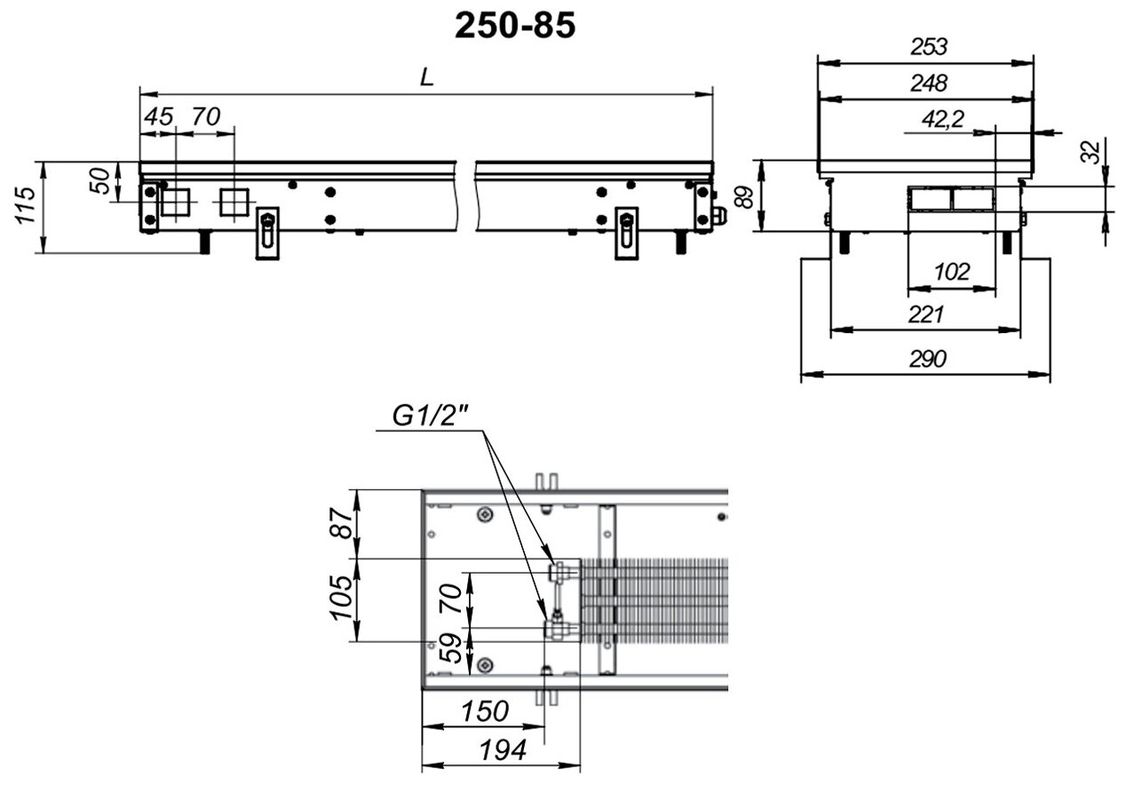 Водяной конвектор Techno Usual KVZ 250 - 85 - 700 мм (внутрипольный / встраиваемый) с естественной конвекцией