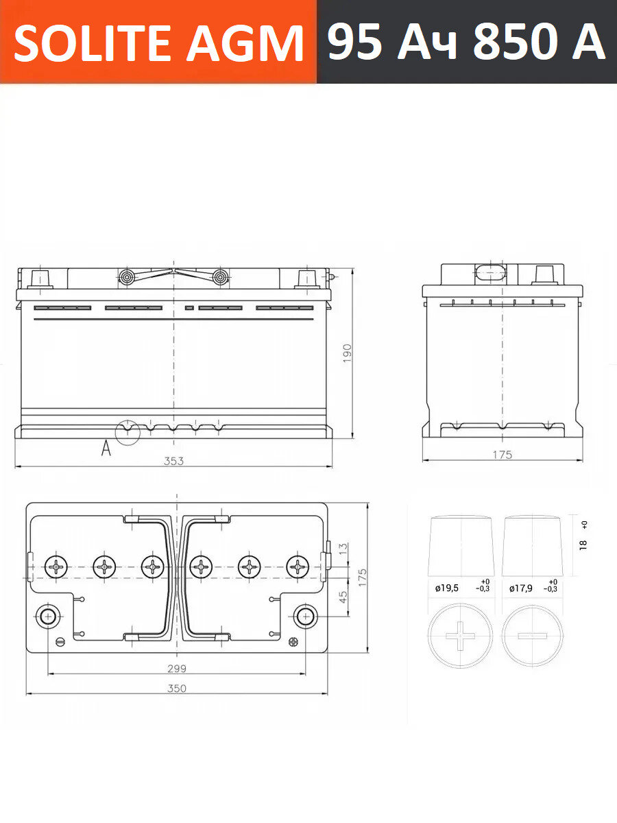 АКБ SOLITE AGM 95, 95 А/часа, Обратной полярности, 353х175х190мм AGM95