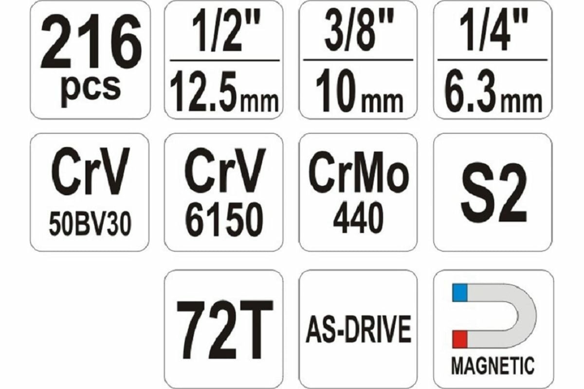 | Головки торцевые подробно | Головки 1/2 ", L = 38/42 мм, CrV 50BV30: 12, 13, 14, 15, 16, 17, 18, 19, 20, 21, 22, 24, 27, 30, 32 мм Головки 1/4 " , L = 25 мм, CrV 50BV30: 4, 4.5, 5, 5.5, 6, 7, 8, 9, 10, 11, 12, 13, 14 мм Головки 1/2 "длинные , L = 76 мм, CrV 50BV30: 10, 12, 13, 14, 17, 19 мм Головки 1/4 "длинные , L = 50 мм, CrV 50BV30: 4, 5, 6, 7, 8, 9 мм Специальные головки 1/2 " , CrV 50BV30: 17, 19, 20, 23 мм Головки Torx 3/8 дюйма, CrV 50BV30: E8, E10, E12, E14, E16, E18, E20 |