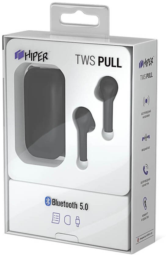 Наушники Hiper TWS PULL Bluetooth 5.0 гарнитура Li-Pol 2x40mAh+400mAh, черный