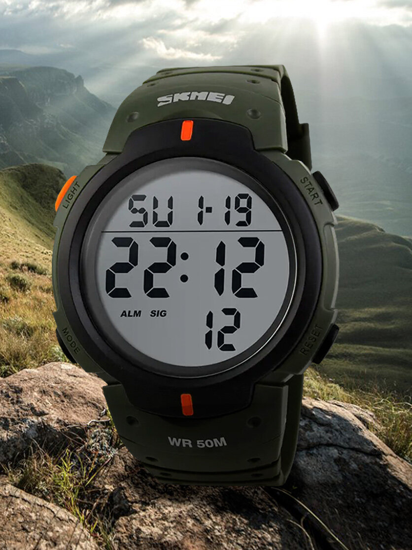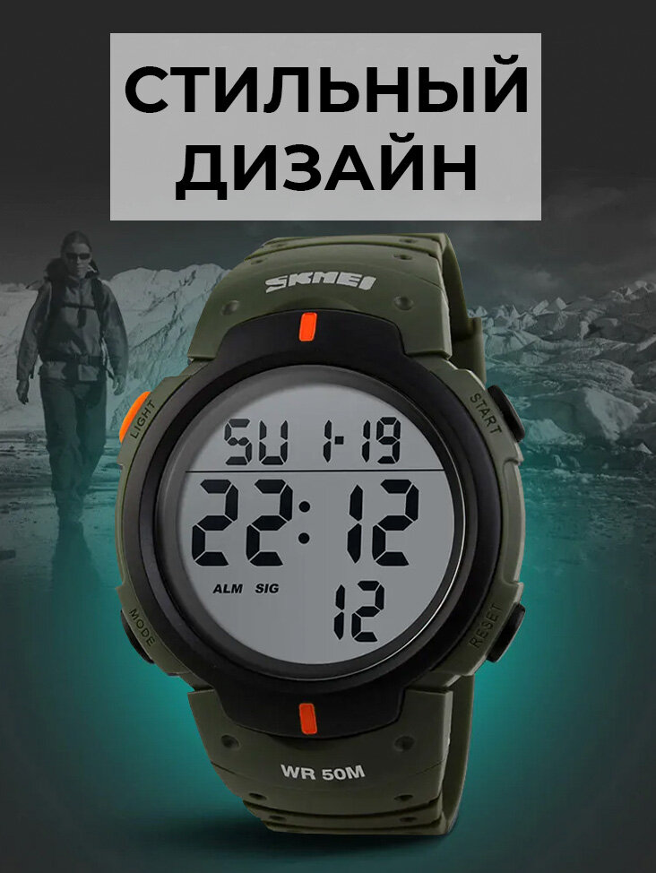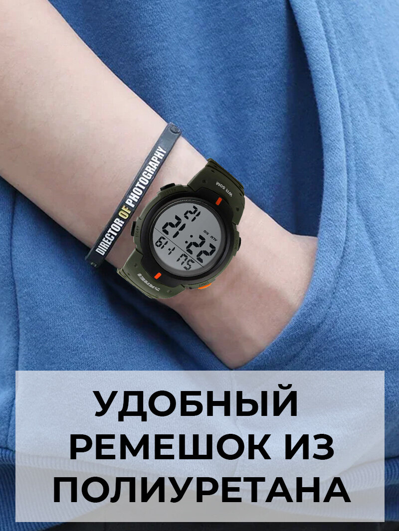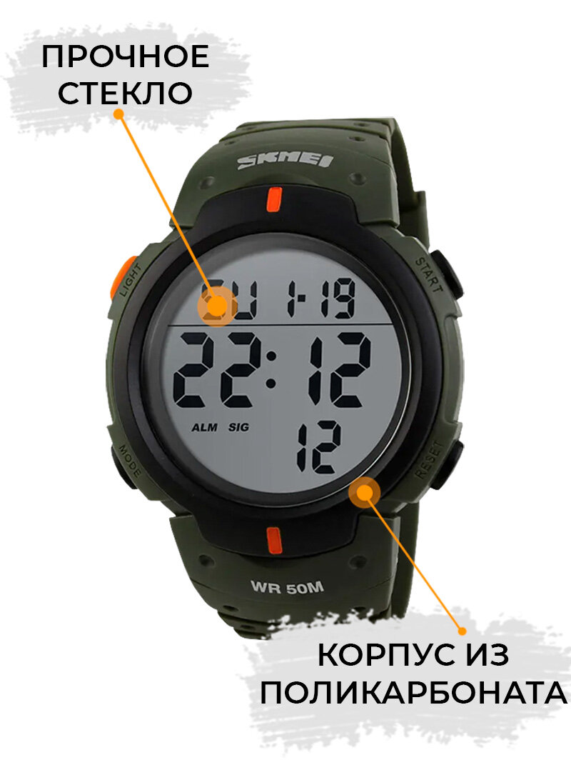 Часы наручные спортивные электронные мужские SKMEI кварцевые, с секундомером и подсветкой, цвет хаки