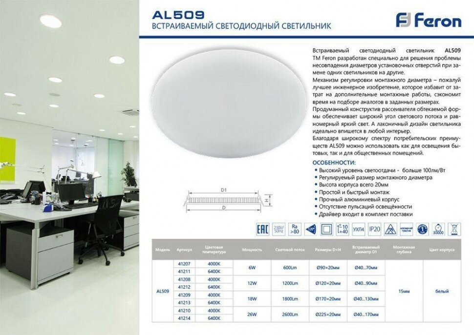 Светодиодный светильник Feron AL509, 12W, 4000K, 1200Lm, встраиваемый с регулируемым монтажным диаметром (до 90мм), белый, 41208