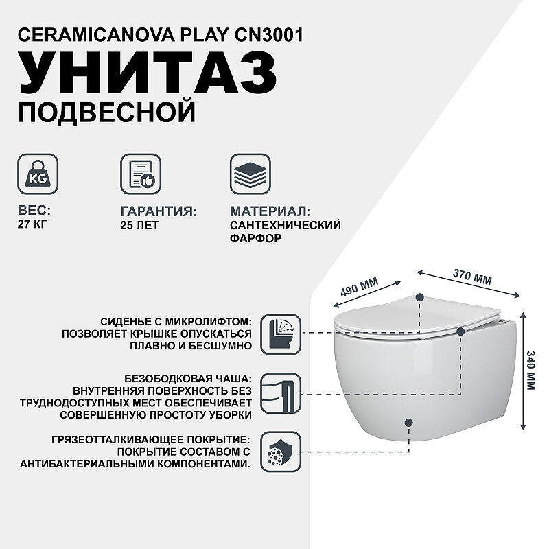 Унитаз подвесной Ceramicanova Play 370х490х340 безободковый, сиденье микролифт, крепеж, бел. CN3001