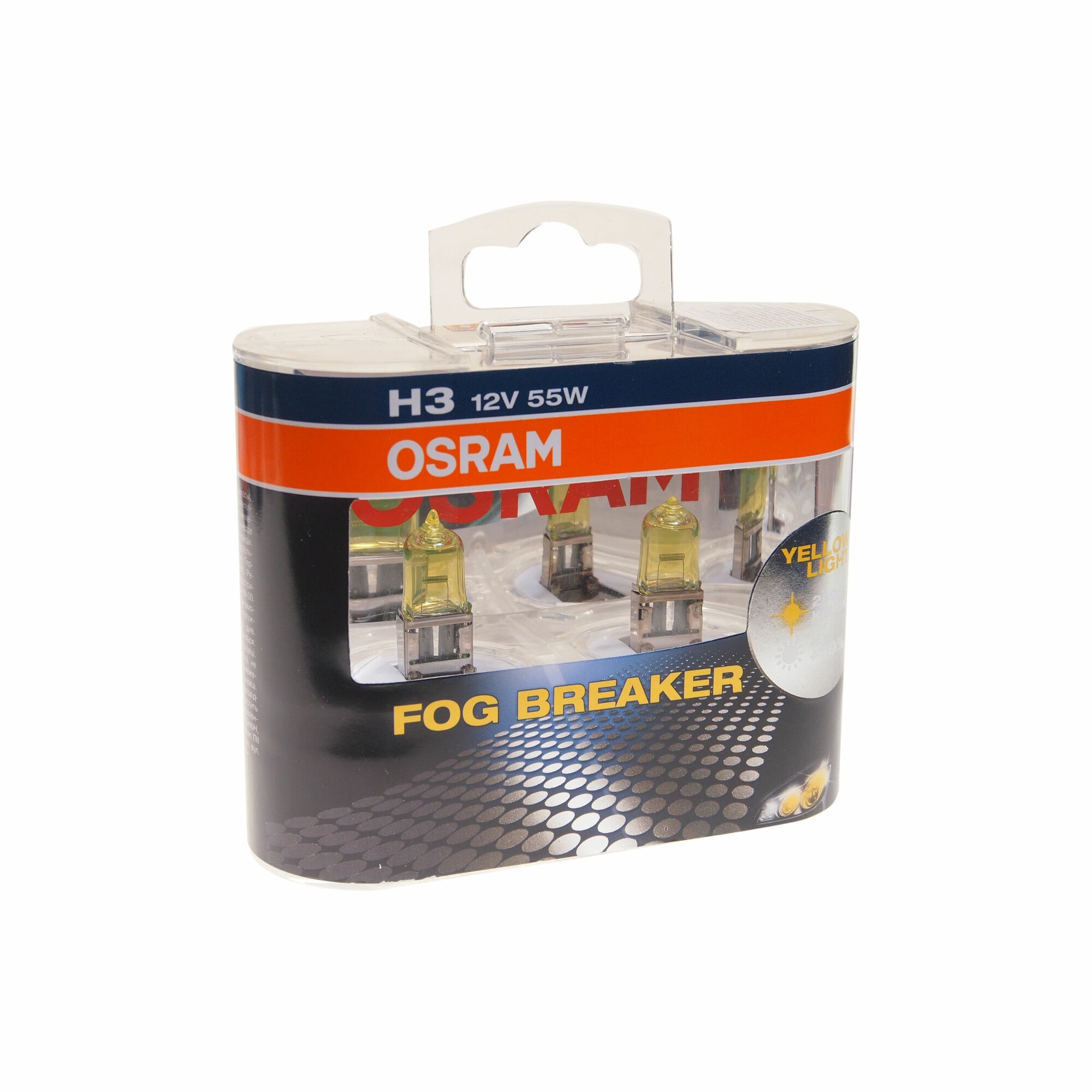 Комплект галогенных ламп 2шт H3 12V 55W PK22s FOG BREAKER (Для плохих погодных условий, на 60% больше света на дороге, на 20м длиннее световой конус, желтый свет 2600K) - OSRAM 62151FBR-HCB