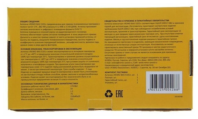 Антенны ТВ Рэмо Антенна комнатная РЭМО BAS-5101-5V (активная, DVB-T2, без б/п, 33 дБи, коробка)