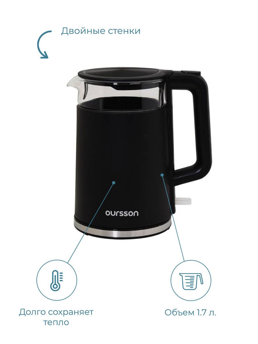 Электрический чайник Oursson KE1732W/BL, 2200 Вт, 1.7л, пластик/стекло, черный