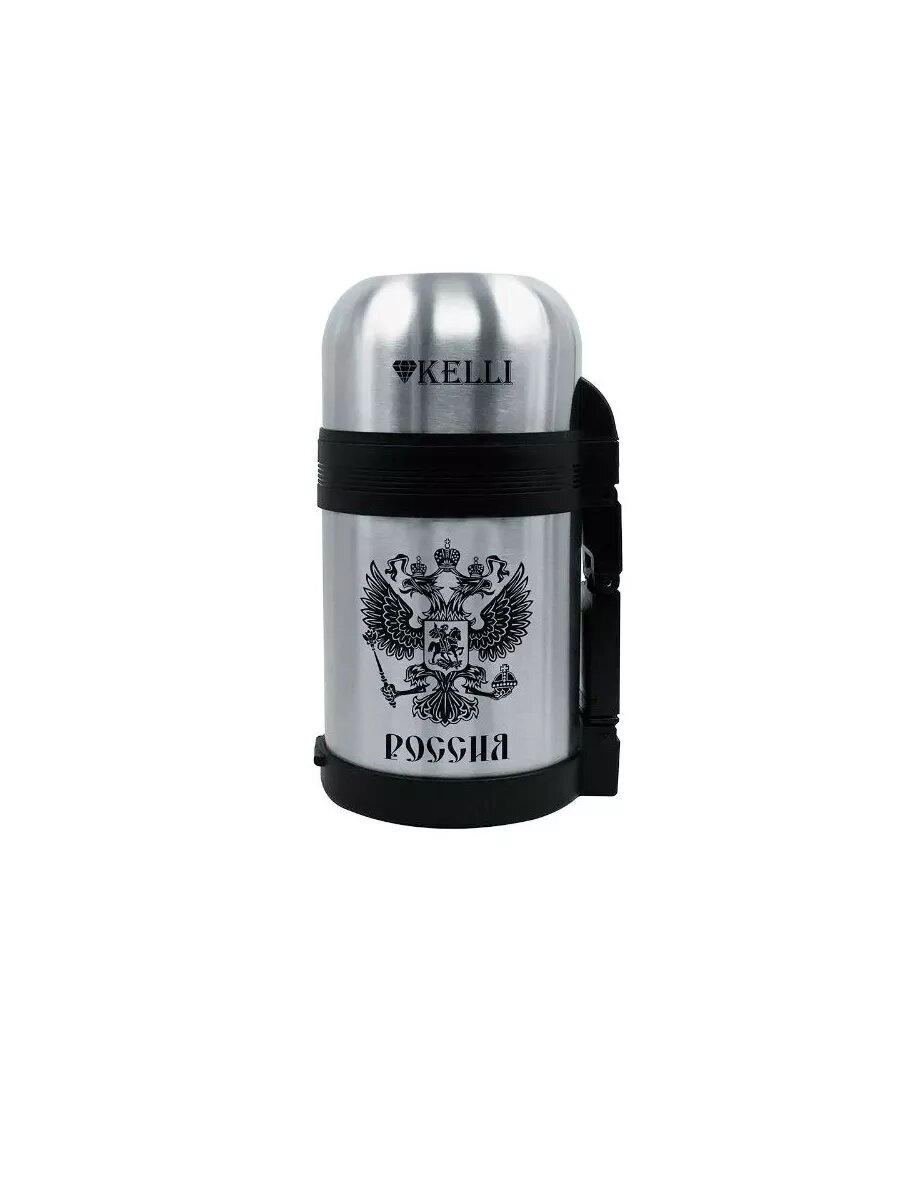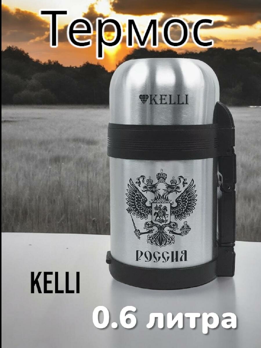 Термос Kelli 0,6 с ручкой и ремешком для переноски, KL0909, серебристый, нержавеющая сталь