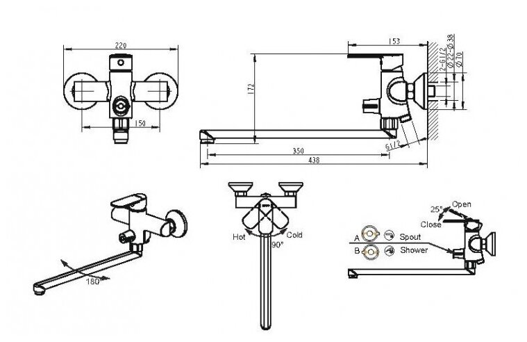 Смеситель для ванны длинный излив Bravat Louise F6191183CP-01L-RUS