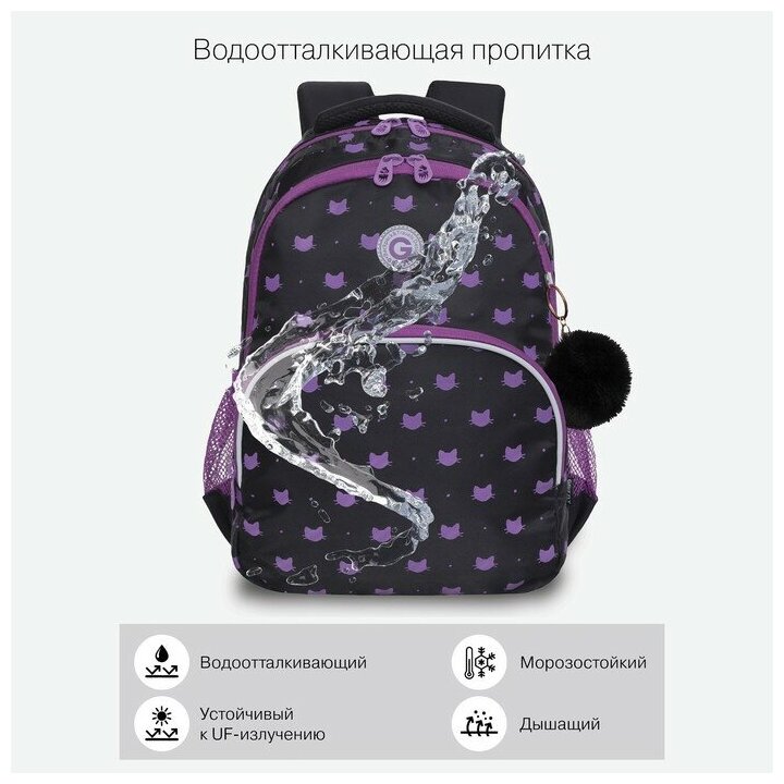 Школьный рюкзак с ортопедической спинкой GRIZZLY RG-360-5 черный - лаванда, грудная стяжка, 2 отделения, 810 грамм, 40x27x20см