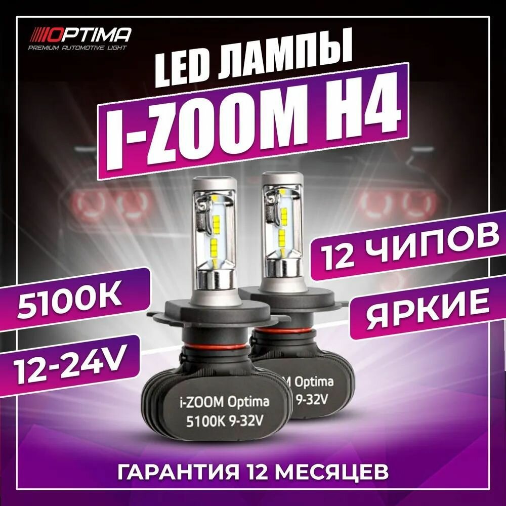 Лампы светодиодные, Optima, H4, LED i-ZOOM, чип Seoul-CSP,White белый свет(5100K).Устанавливаются в машины и мотоциклы с бортовой сетью 12 вольт и 24 вольта , (2 шт.)