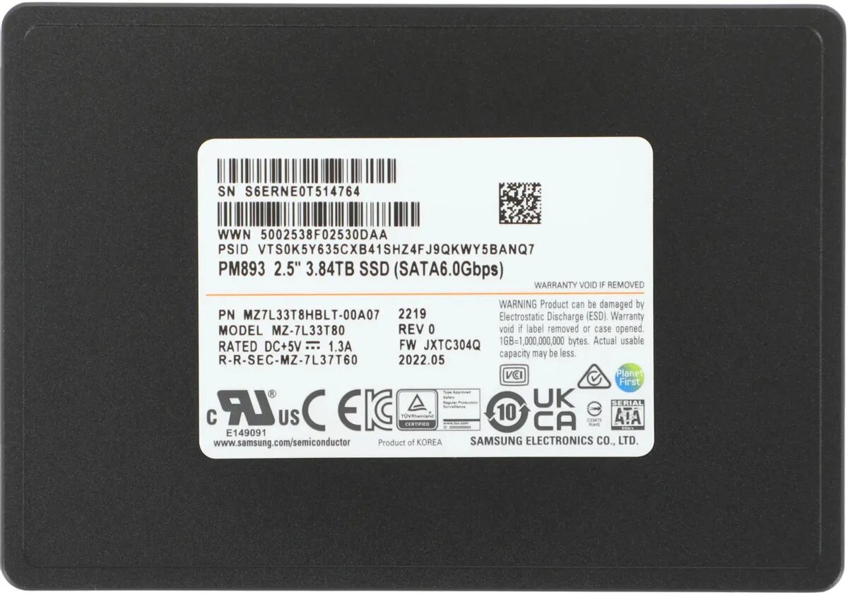 Твердотельный накопитель Samsung PM893 3.8 ТБ SATA MZ7L33T8HBLT-00A07 OEM