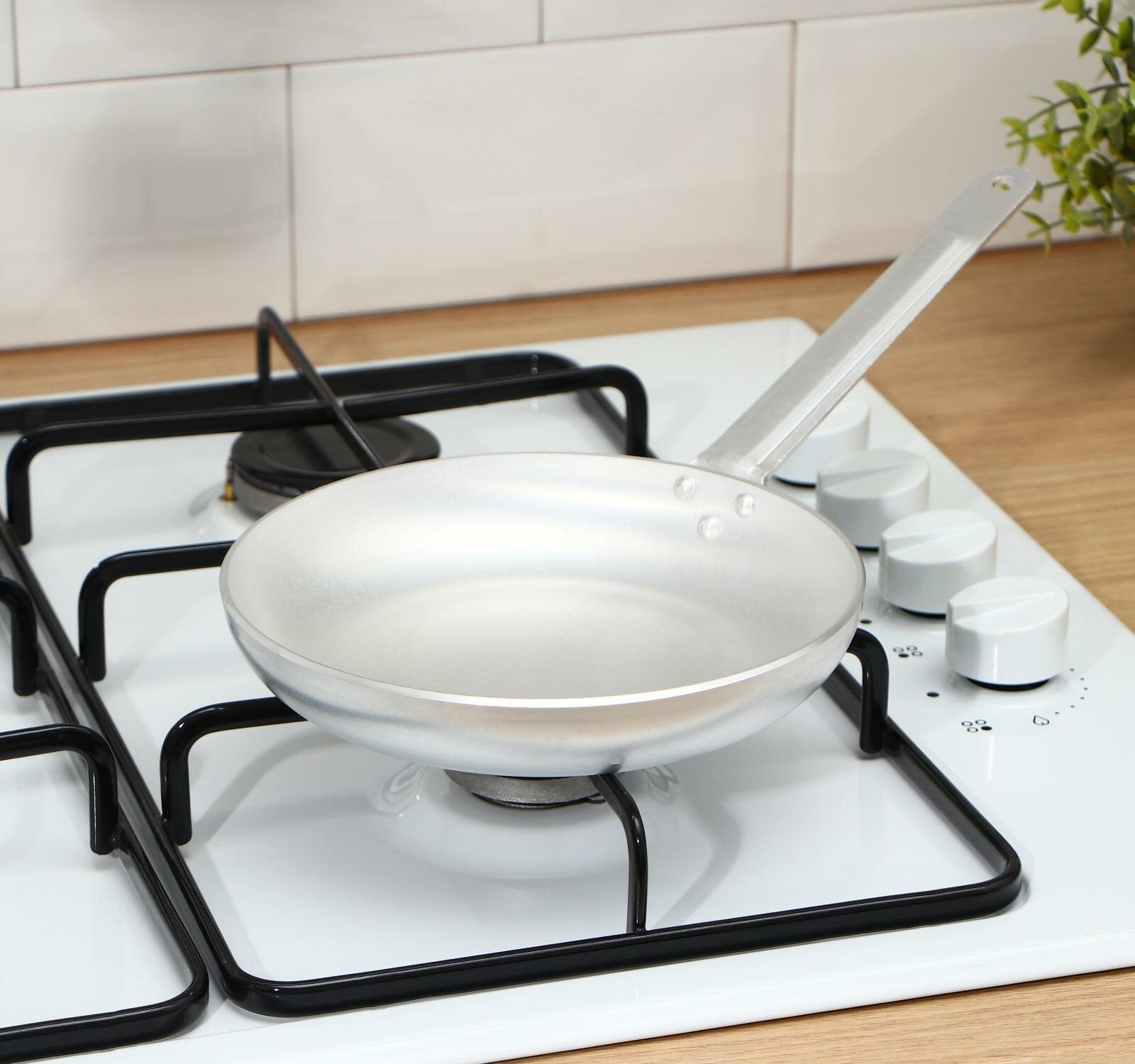 | Плюсы: | обычная алюминиевая сковородке, лёгкая, ручка не горит на газовой горелке |