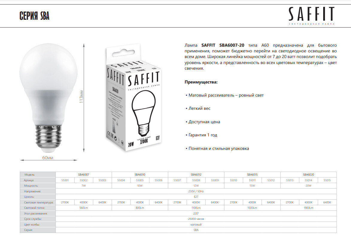 Ниже Вы можете прочитать отзывы на Лампа светодиодная SAFFIT SBA6020 Шар E27 20W 2700K 55013, ознакомится с подробными характеристиками, посмотреть интересные обзоры и фотографии на Лампа светодиодная SAFFIT SBA6020 Шар E27 20W 2700K 55013.