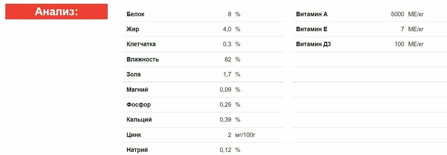 | Пищевая ценность | белок 8%, жир 4%, зола 1,7%, клетчатка 0,3%, влажность 28% |