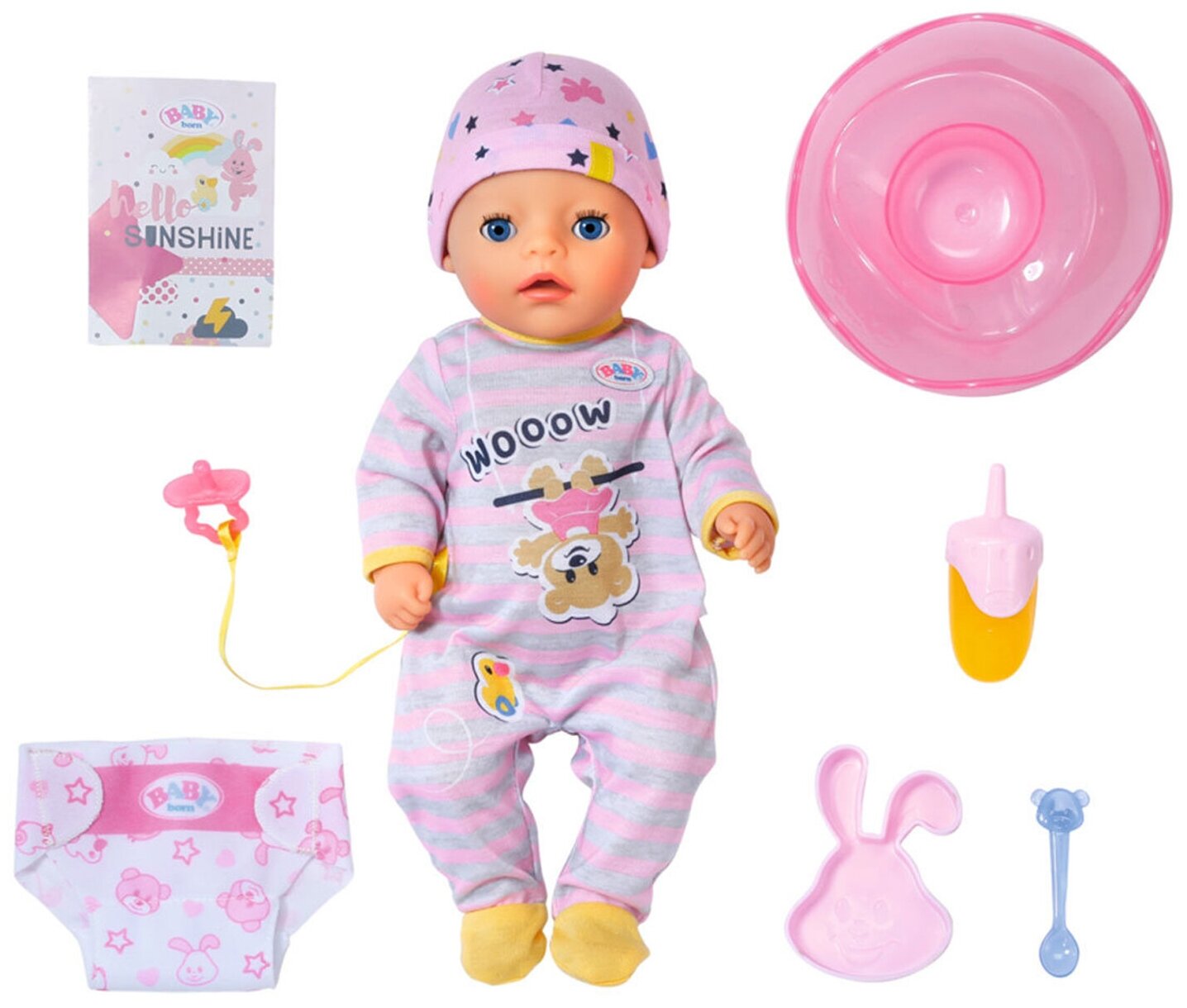 | Комплектация | кукла, комплект одежды, свидетельство о рождении, бутылочка для питья, соска, тарелка, ложка, горшок, запасной подгузник |