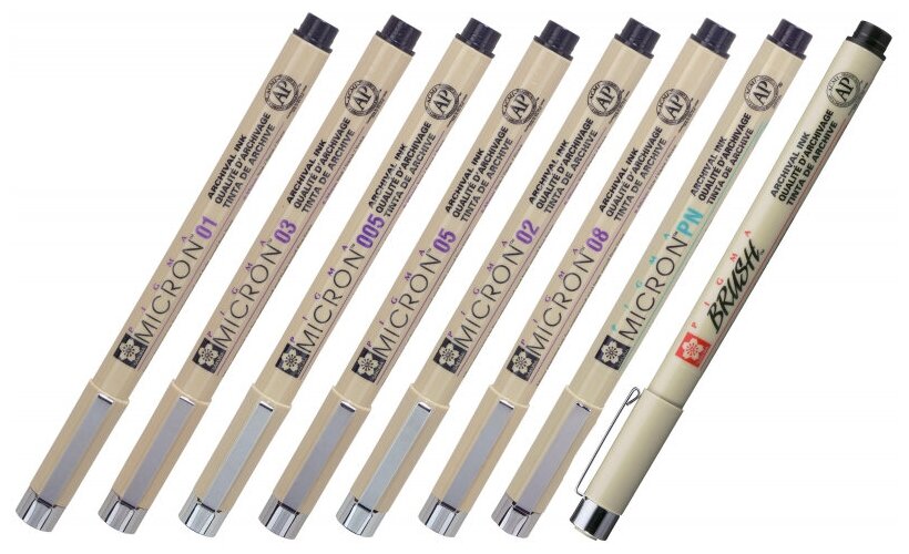 | Комплектация | 6 чёрных ручек Pigma Micron: 005 (0.2мм), 01 (0.25мм), 02 (0.3мм), 03 (0.35мм), 05 (0.45мм), 08 (0.5мм), 1 чёрная ручка Pigma Brush, 1 чёрная ручка Pigma PN (Plastic Nib) |