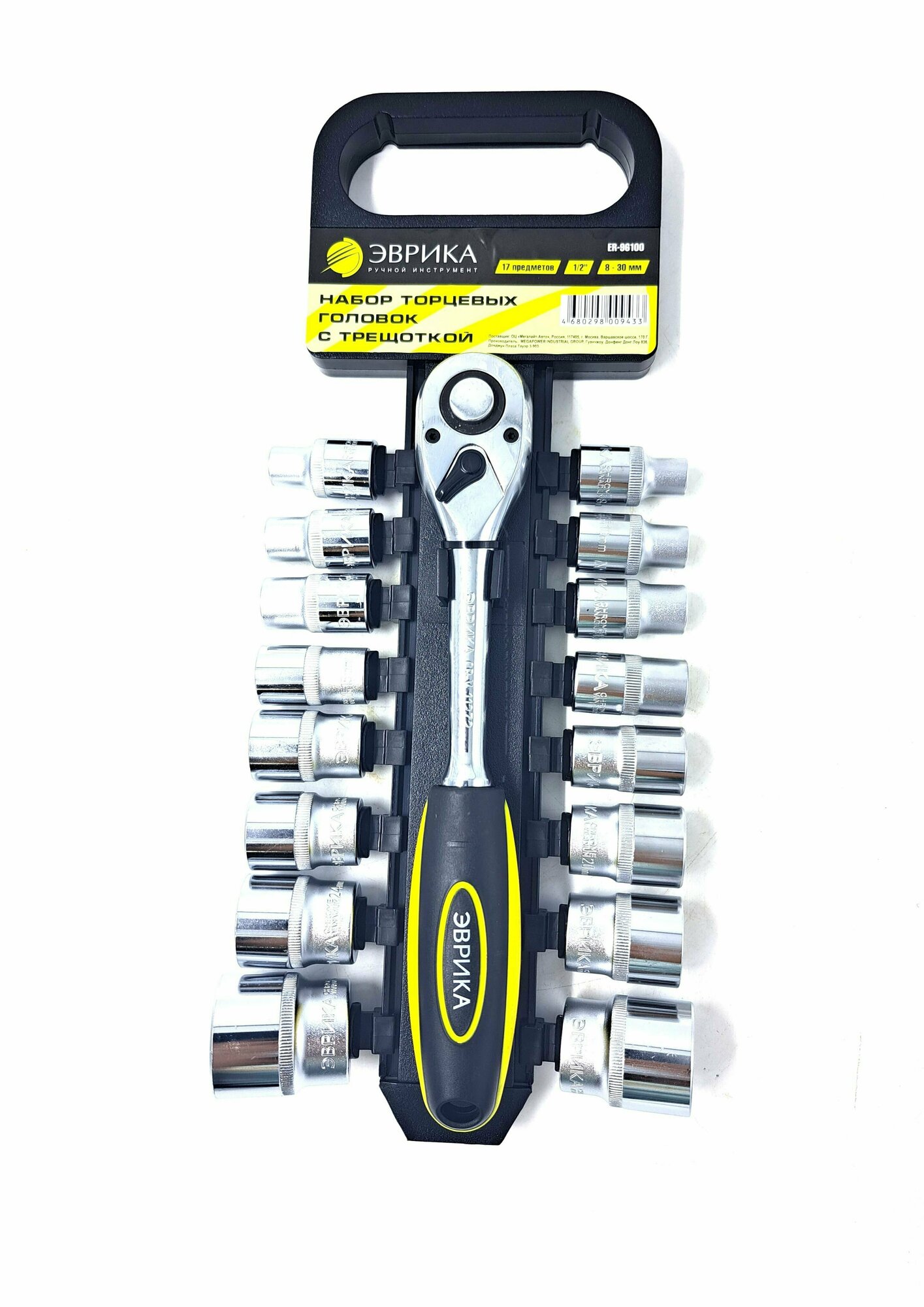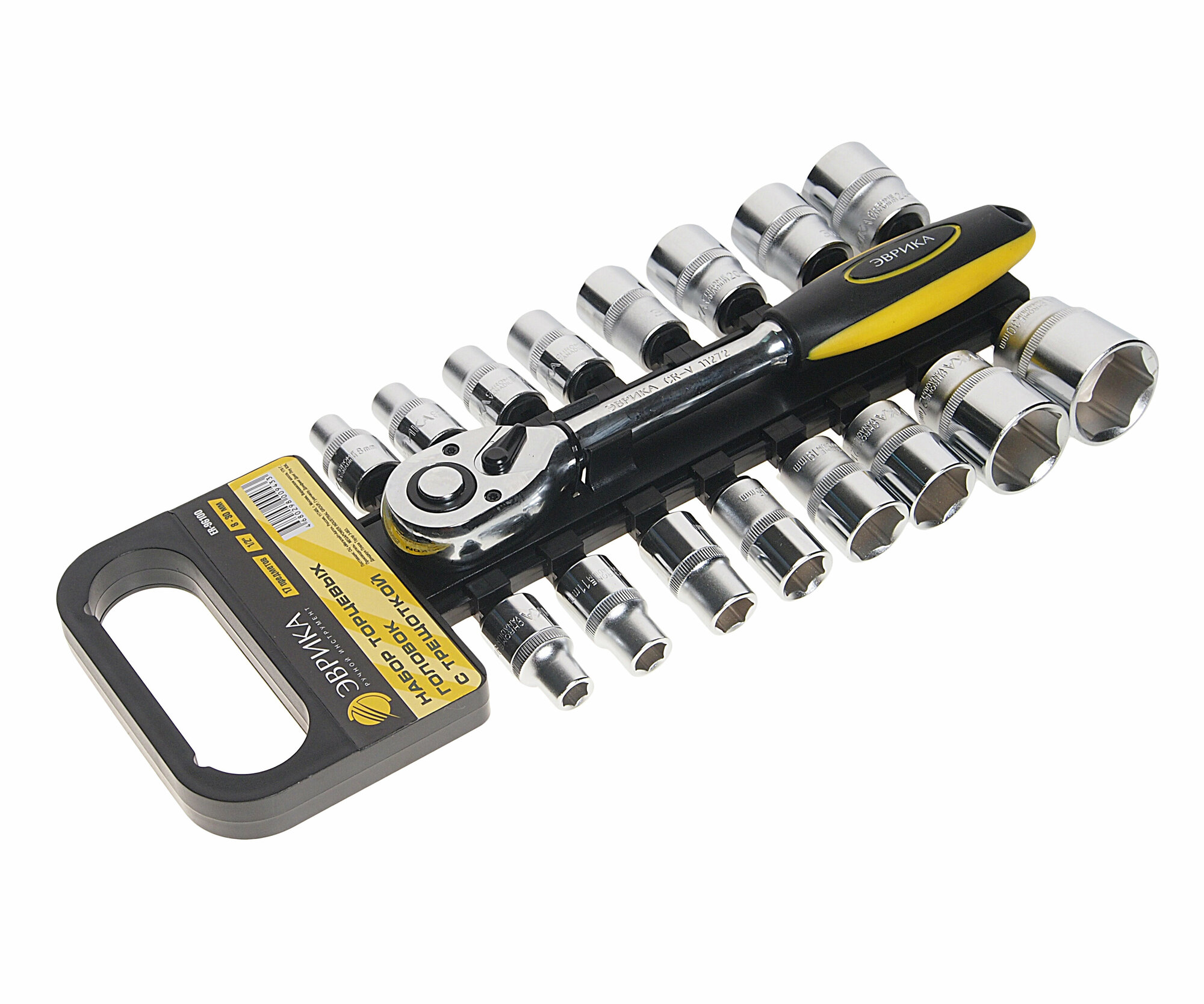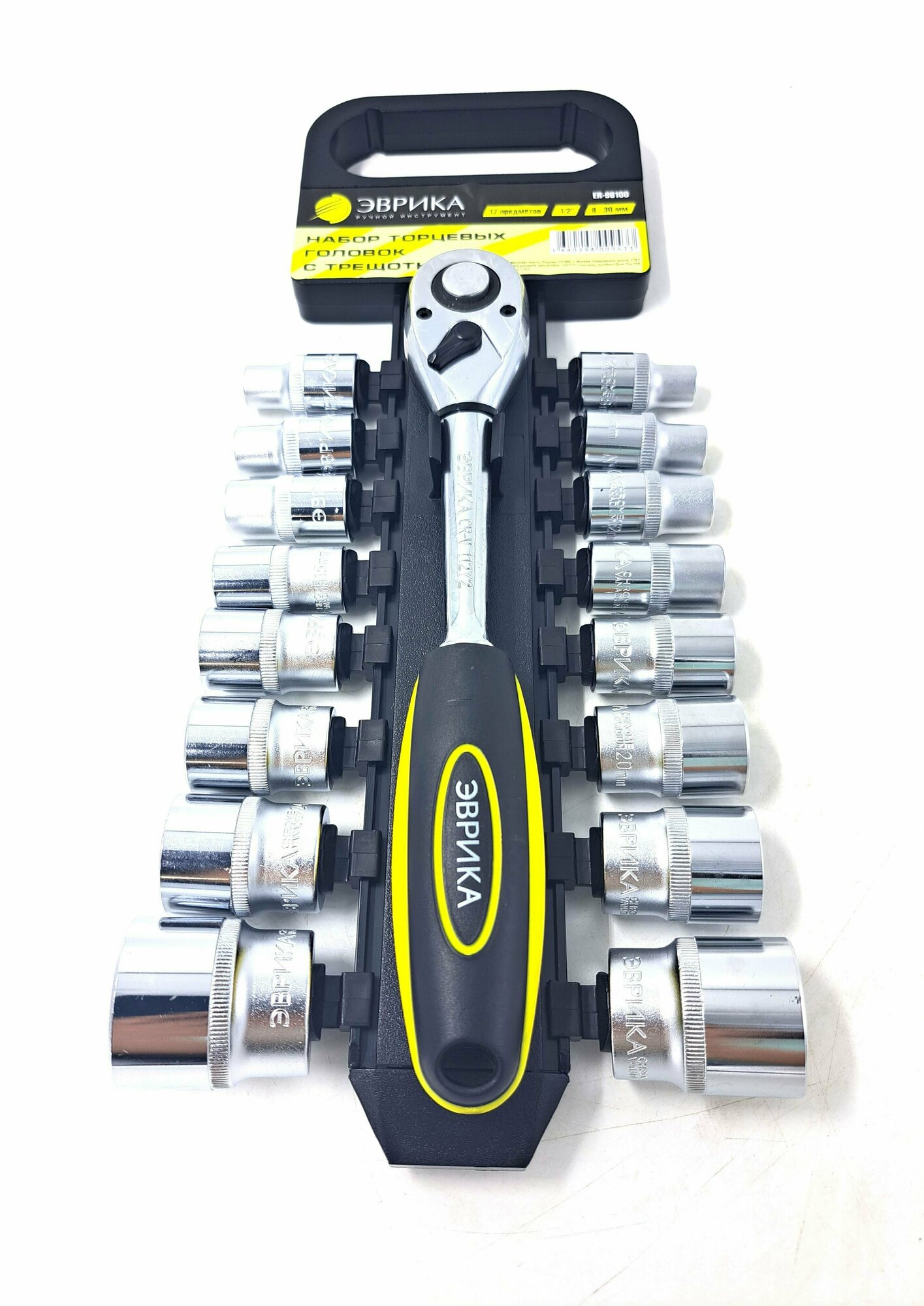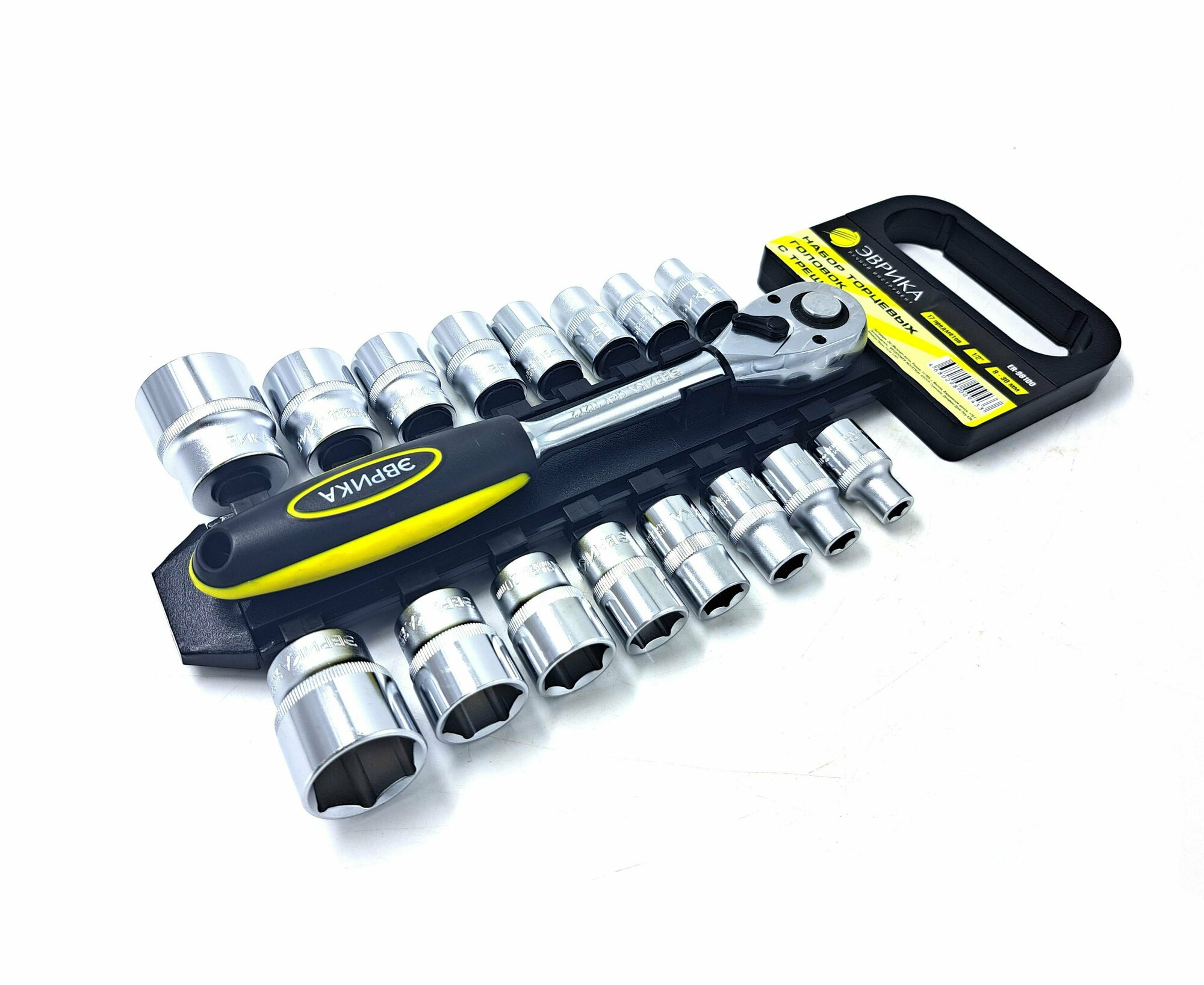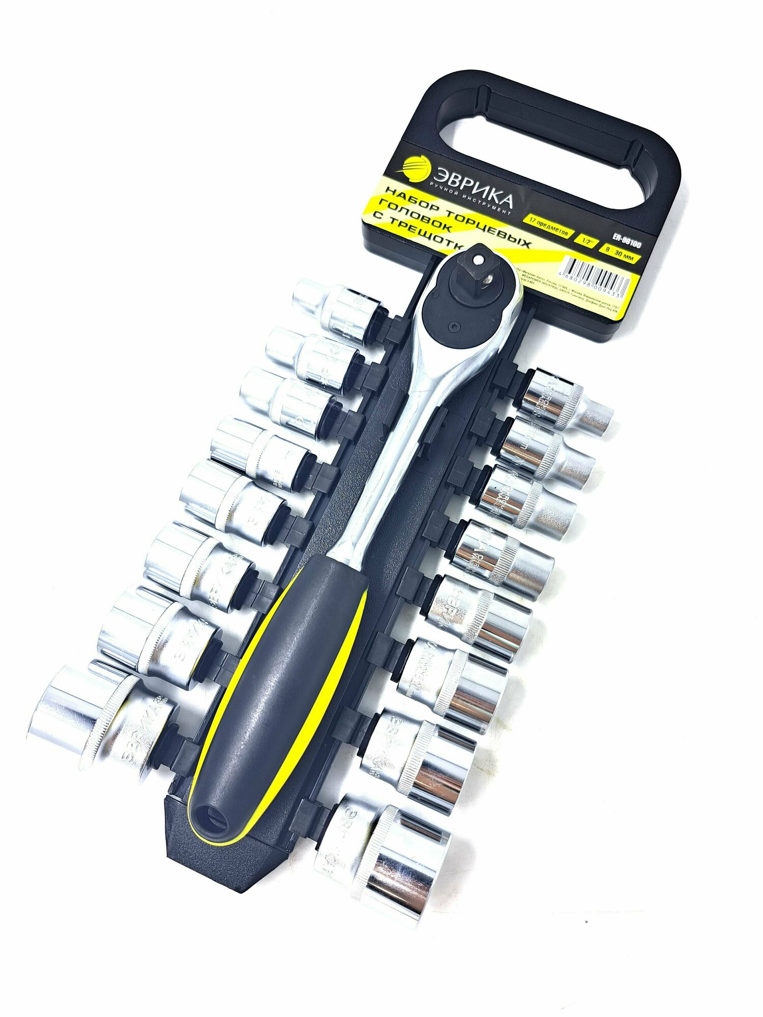 Купить Набор головок торцевых с трещоткой ER-96100 1/2" DR 8-30мм 17 предметов, 72 зуб. (на держателе) эврика