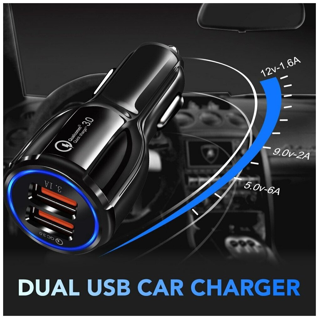 Быстрая зарядка автомобильная на два usb в прикуриватель авто совместима легковые и грузовые машины 12-24v 32W 6A QC 3.0 интересное: