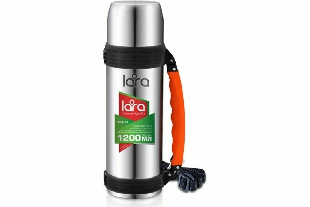 Купить LR04-03 термос LARA - 1.20л, ручка, кнопка, ремешок, двойные стенки, крышка-стаканчик, нерж сталь