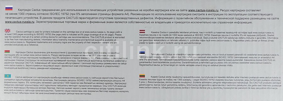 | Отзыв: | Больше года стоит в принтере - никаких проблем не возникло. Принтер пишет, что неорининальный картрижд, но никаких ограничений не создает. Емкость тоже в порядке - уже не одну сотню листов напечатал. Купил еще такой же, плюс цветные, тоже Кактус. Посмотрим... |