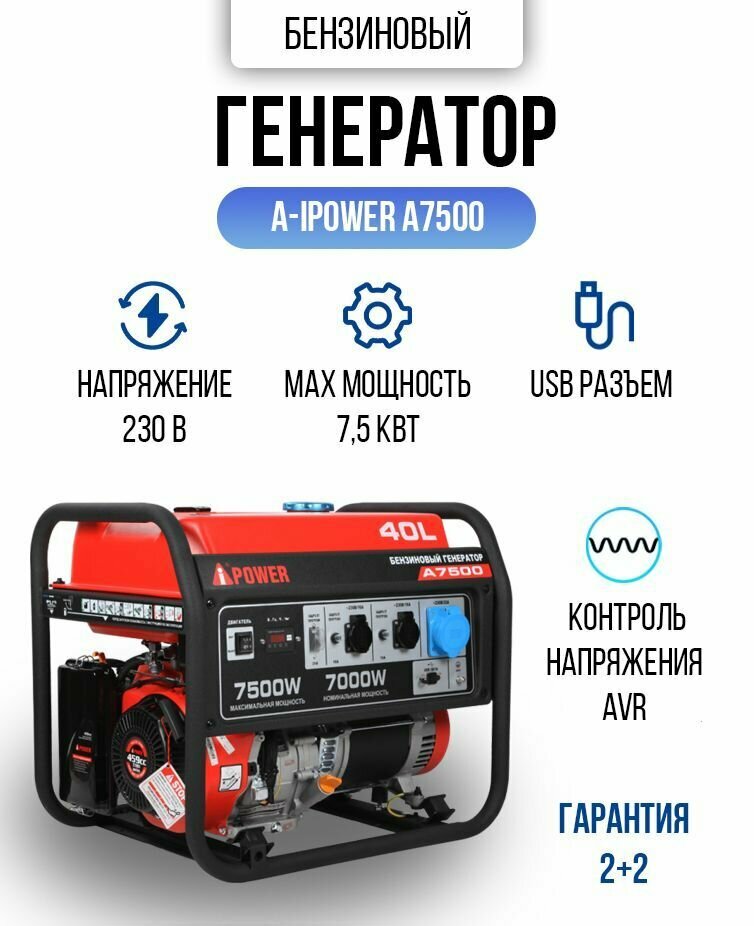 Генератор бензиновый A- IPOWER A7500 7,5кВт, 85,5кг бензогенератор с ручным запуском двигателя и автоматическим регулятором напряжения, электростанция