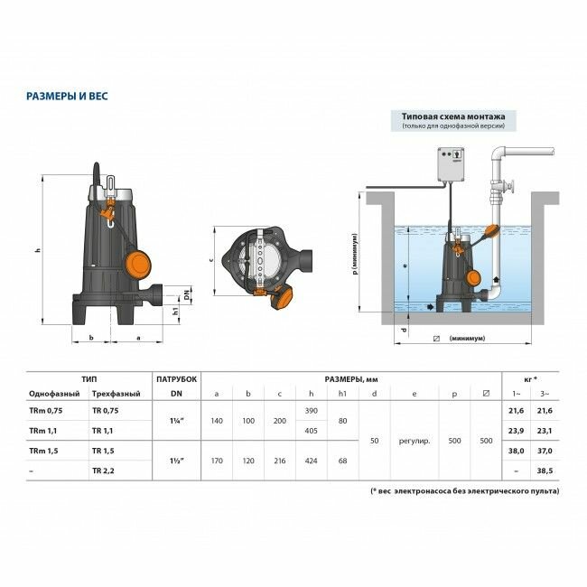 Насос фекальный Pedrollo TRm 1.1 (1,1 кВт, 1x230 В, Qmax 140 л/мин, Hmax 23 м, кабель 10 м)