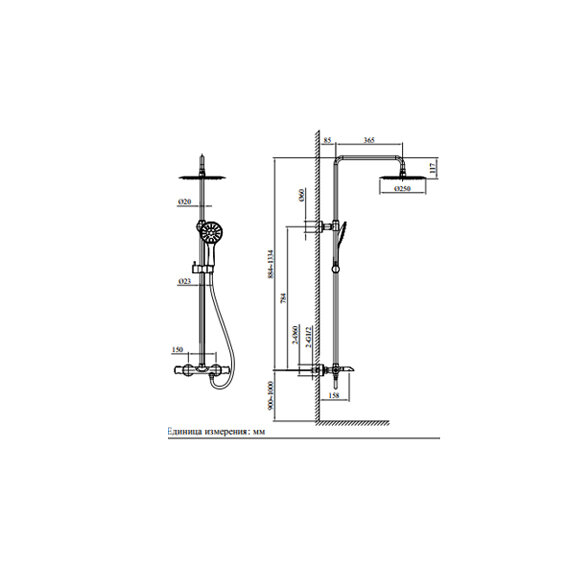 | Комплектация | термостатический смеситель настенного монтажа / телескопическая штанга / ручной душ / гибкий полимерный шланг / регулируемый по высоте латунный верхний душ / эксцентрики / чаши декоративные |