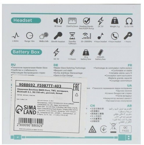 Наушники Borofone BW05 Pure, TWS, вкладыши, Bluetooth 5.1, 30/250 мАч, дисплей, белые 9088692