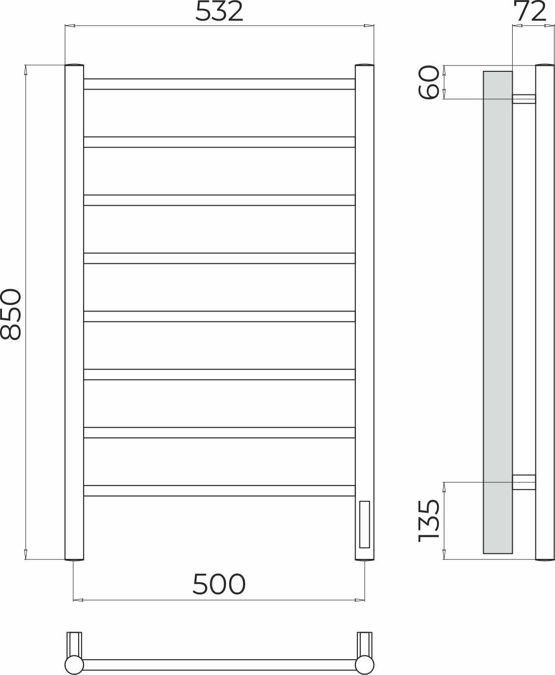 "Аврора" (скрытая проводка) электрический полотенцесушитель TERMINUS (532 мм / 850 мм / 500 мм)