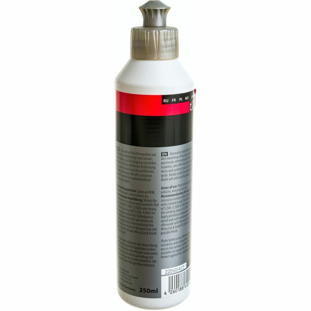 | Способ применения | Производить обработку перекрёстным способом с помощью ротационной полировальной машины и мехового полировального круга Lammfell-Pad (при аншлифе зернистостью 1200 - 2500) или Heavy Cut Pad (при аншлифе зернистостью 1500 - 3000). Отрабатывать абразивную политуру при средней частоте вращения и среднем нажиме. Превосходный вид поверхности достигается благодаря дополнительной полировке с помощью политуры для зеркального блеска с устранением эффекта голограммы Micro Cut M3.02 или Micro Cut & Finish P3.01. |