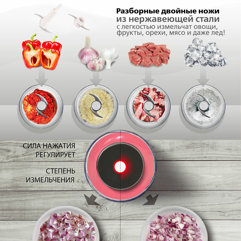 | Плюсы: | Пластик крепкий, без запаха. Мельчит мгновенно. Красивый дизайн, компактная форма. |