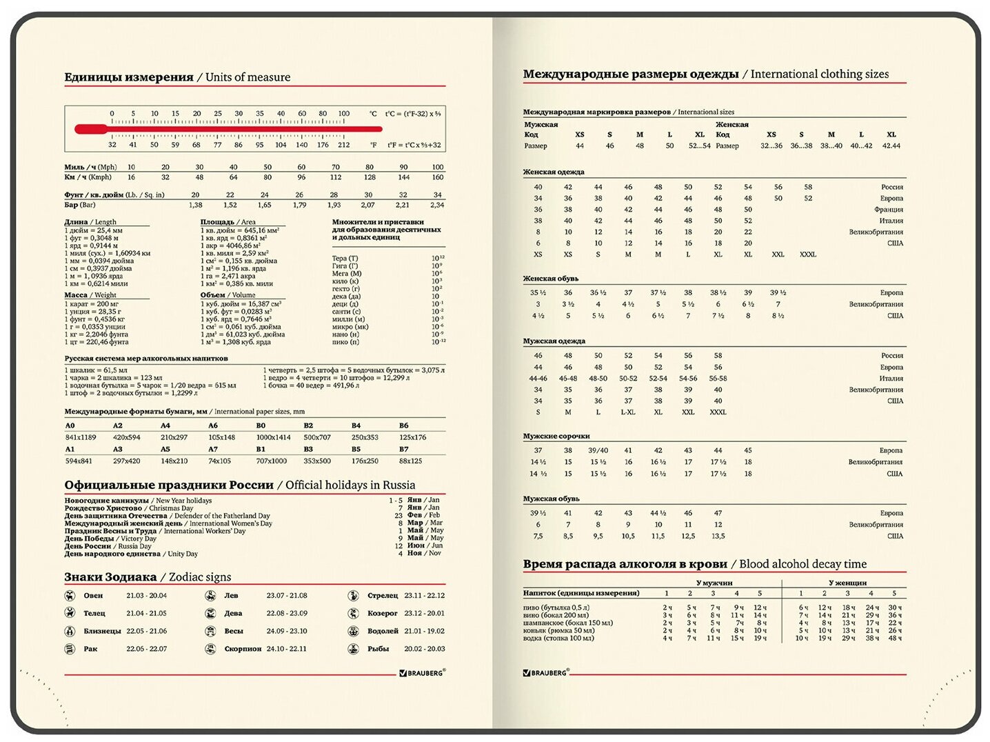 | Особенности | календарь / перфорация уголков / справочная информация / ляссе / прошивка по периметру обложки / закругленные углы |