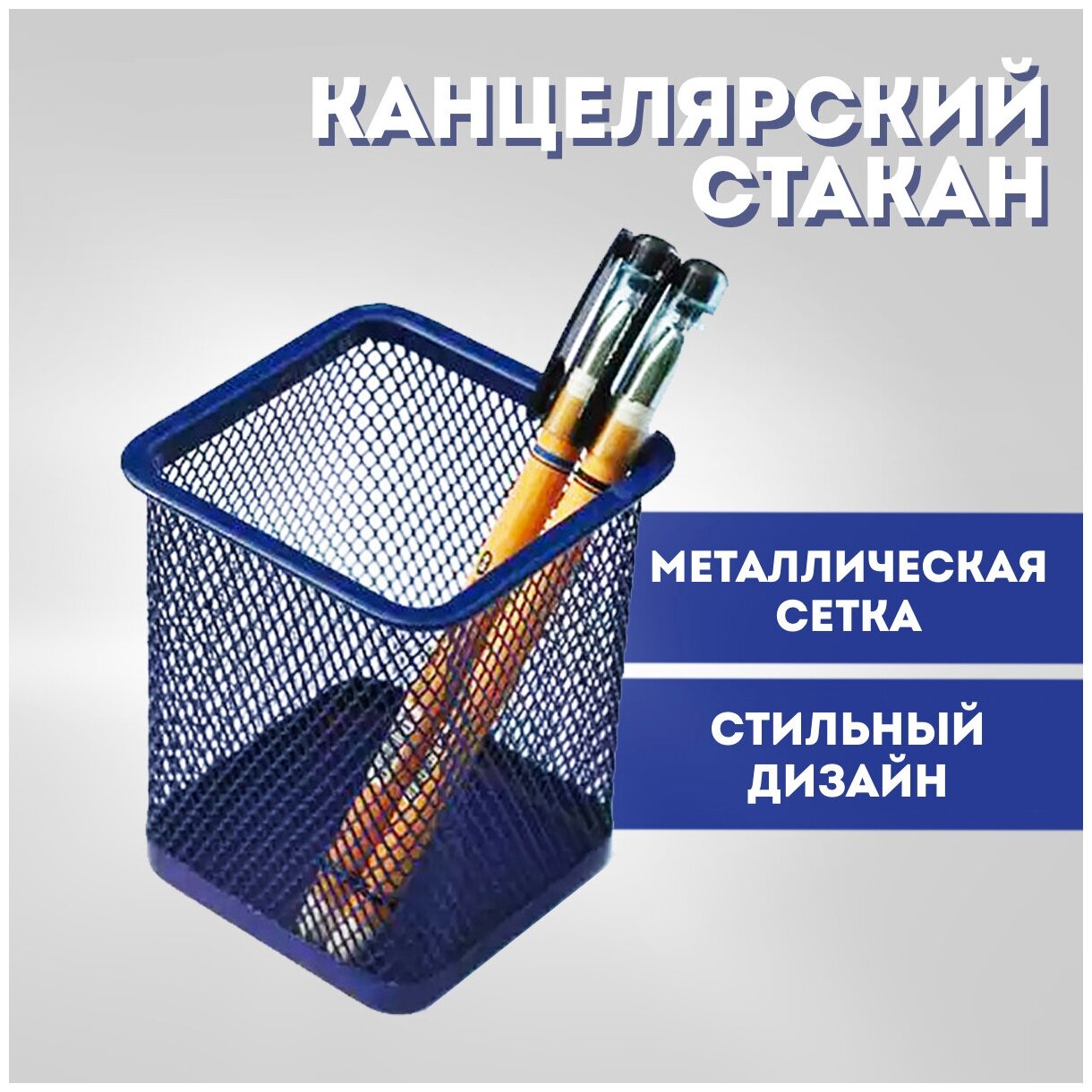 Купить Стакан канцелярский квадратный, металлический, синий цвет, 95 x 70 мм