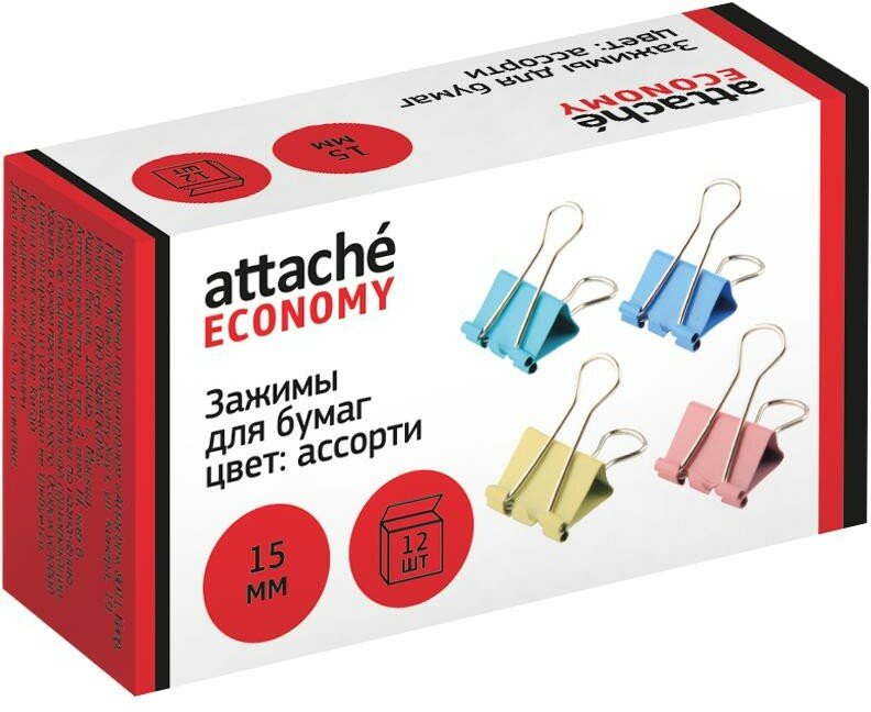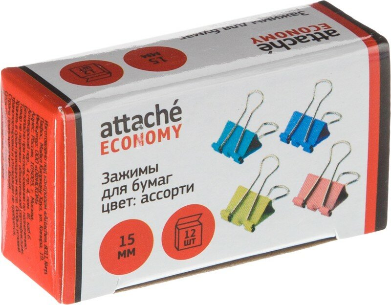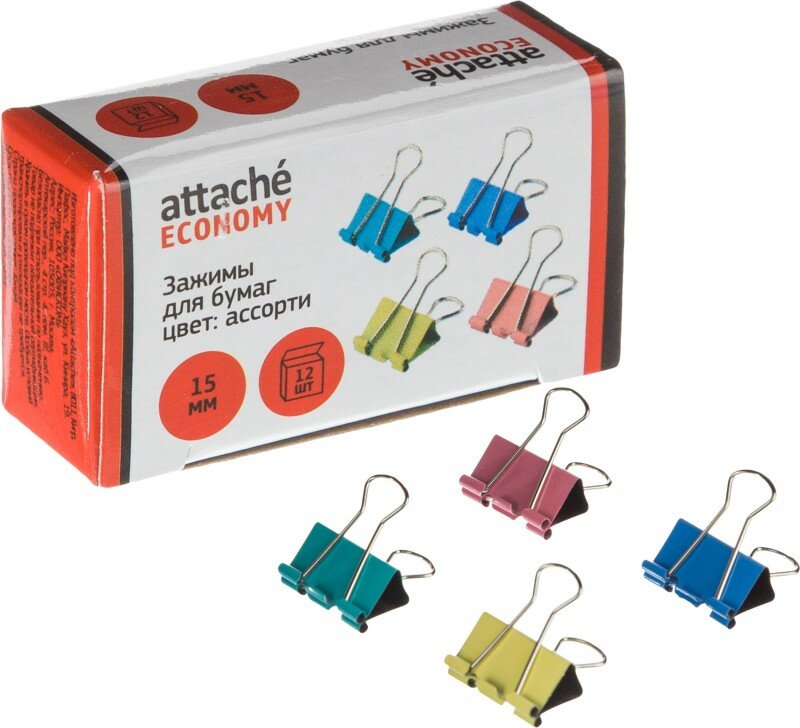 Зажим д/бумаг 15мм, 12 шт/уп Attache Economy, цветные, в карт.коробке 1238038