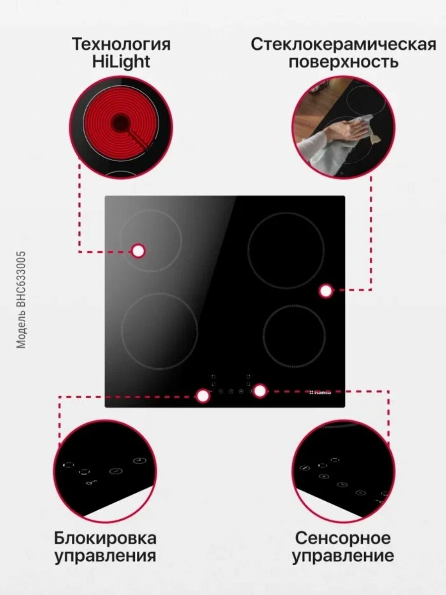 Электрическая варочная панель Hansa BHC633005, стеклокерамическая поверхность, блокировка от детей, таймер, автоотключение, индикация остаточного тепла, черная