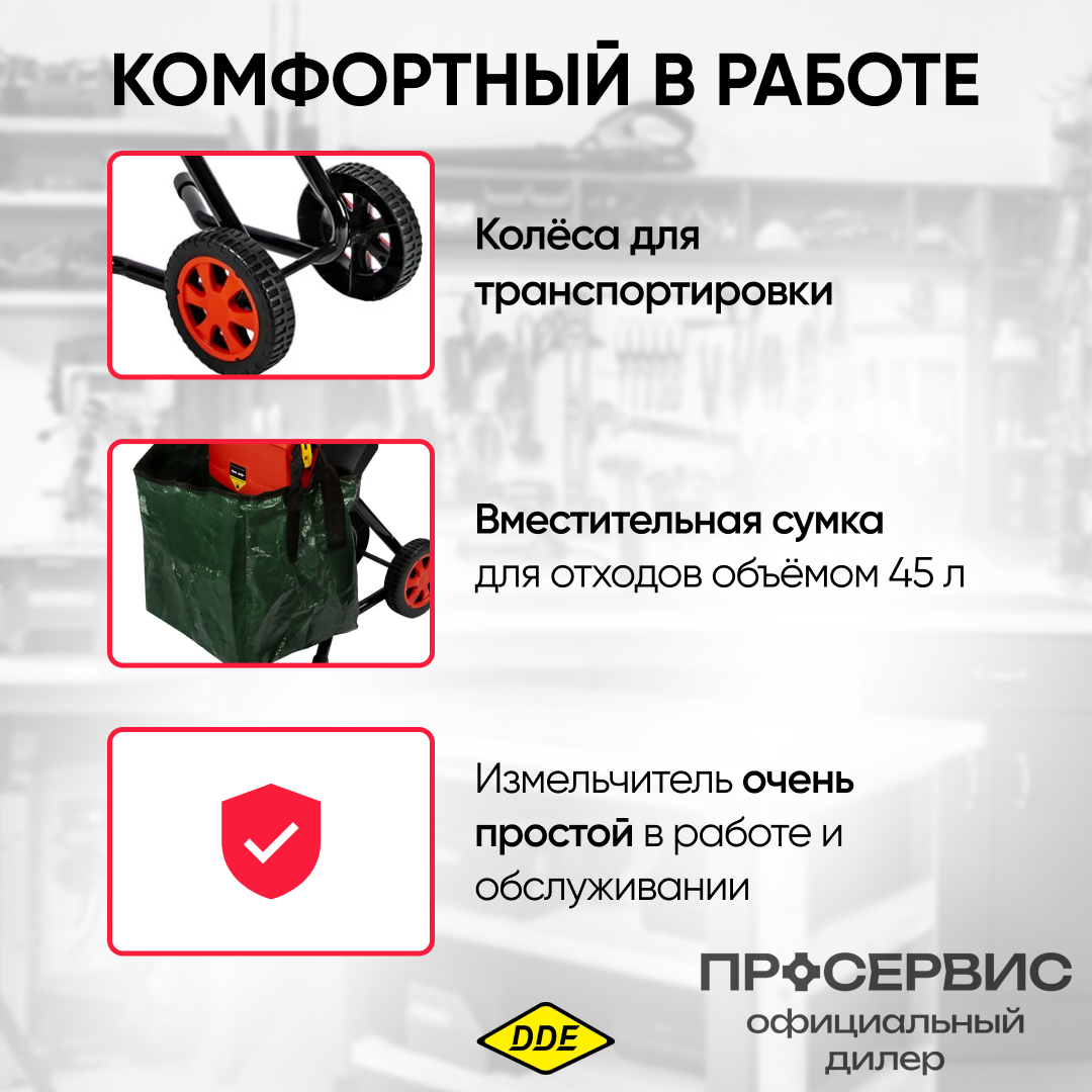 Садовый измельчитель DDE SH 250 2,5 кВт, ножи, толщина до 45 мм, сумка для сбора 45 л