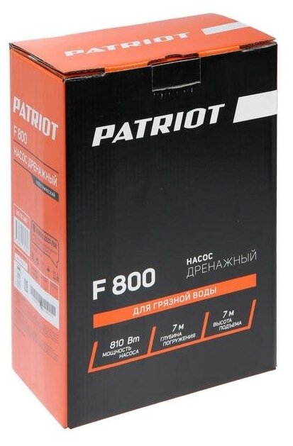 Насос дренажный PATRIOT 315302467 F 800 13000 л/мин, 810 Вт, оранжевый/черный