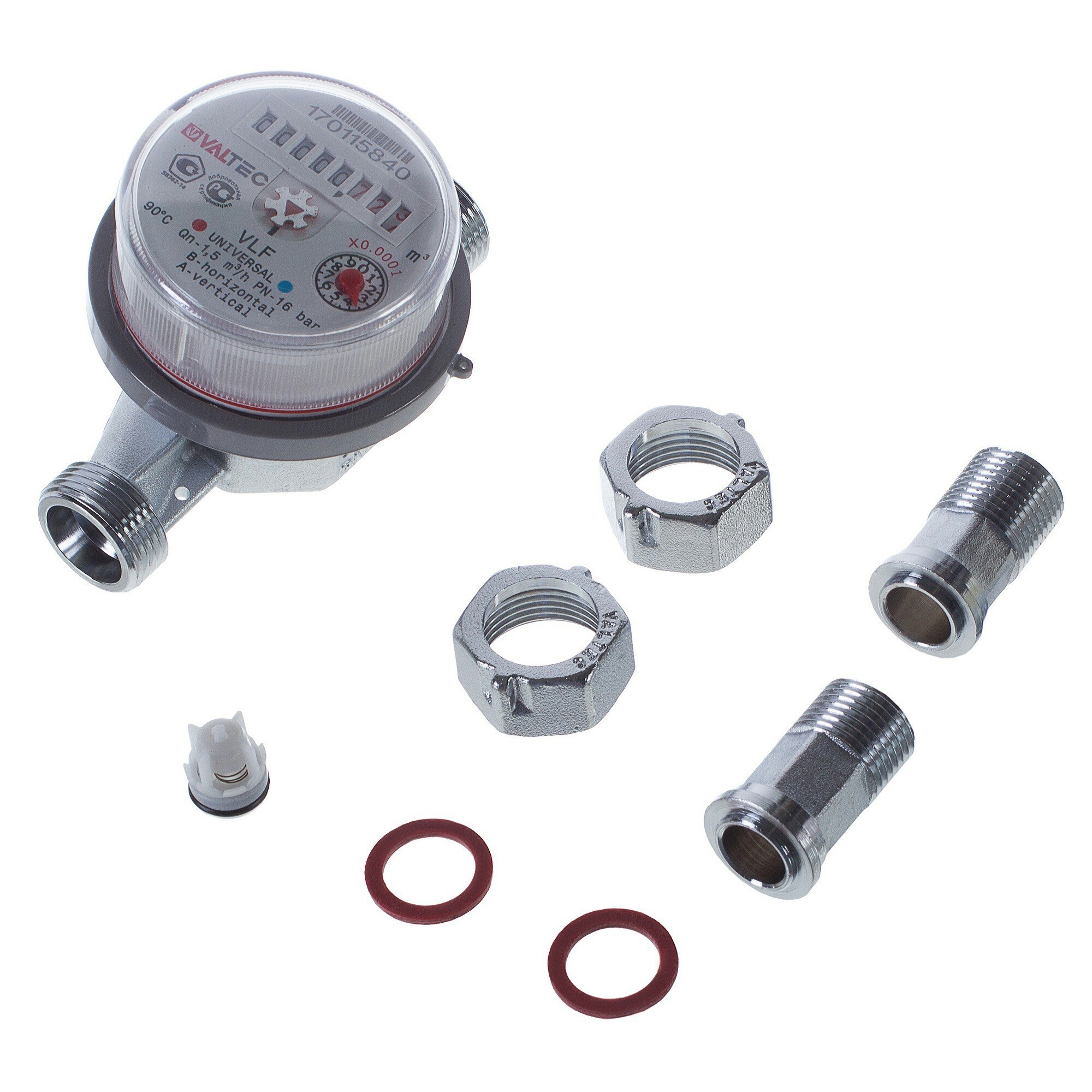 Счетчик для воды 1/2" универсальный VALTEC, длина 110 мм (норма 1.5) / Водосчетчик крыльчатый ДУ 15 для учета расхода горячей и холодной воды в квартире с полусгонами и патрубками 3/4", VLF-15U